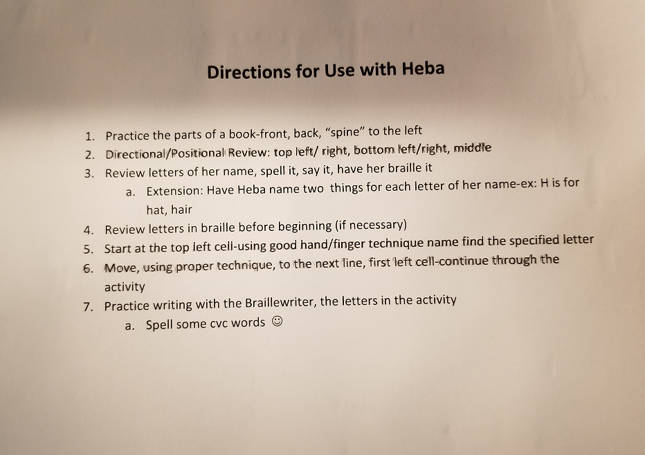 As she began to familarize herself with the braille alphabet and simple English words, we began to write braille experience stories. For example, one day we went outside, took off our shoes and walked barefoot through the grass. Heba enjoyed talking about what we did, while I wrote basic sentences in braille. She “scribbled” her stories on the braillewriter until she became able to write complete sentences. She took her work home and was very excited about “reading” her stories to her family.