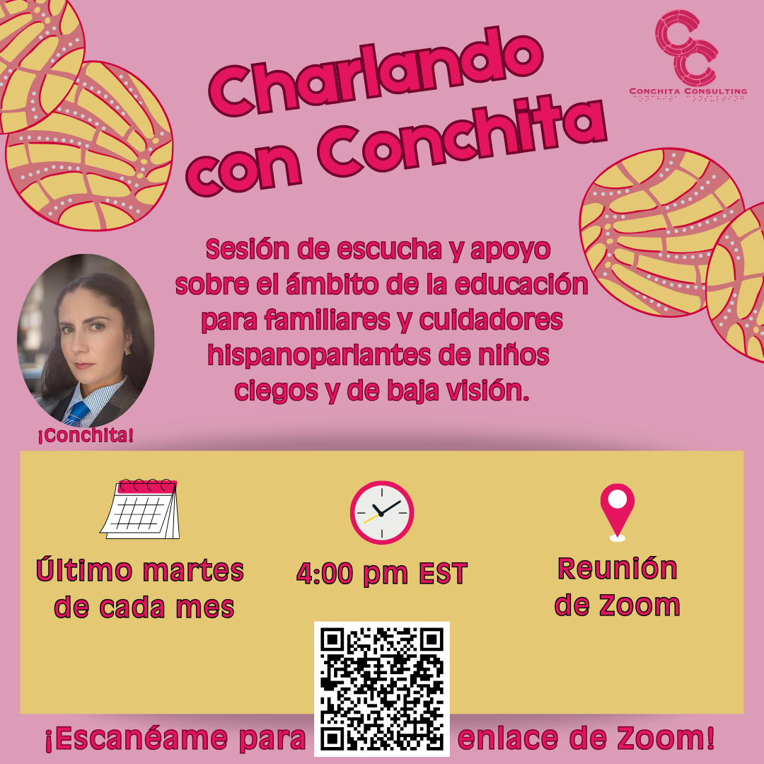 Estoy iniciando un grupo de apoyo mensual para padres hispanohablantes de estudiantes ciegos y con baja visión. Este será un lugar para hablar en español, hacer preguntas y construir una comunidad. Será el último martes de cada mes. Nuestra primera sesión será el 28 de enero a las 4 p. m. EST. No es necesario registrarse. Enlace de Zoom aquí