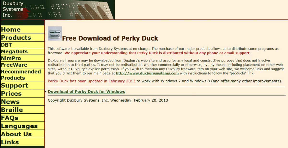 Perky Duck is a freeware program that allows your computer keyboard to emulate a braille writer.
