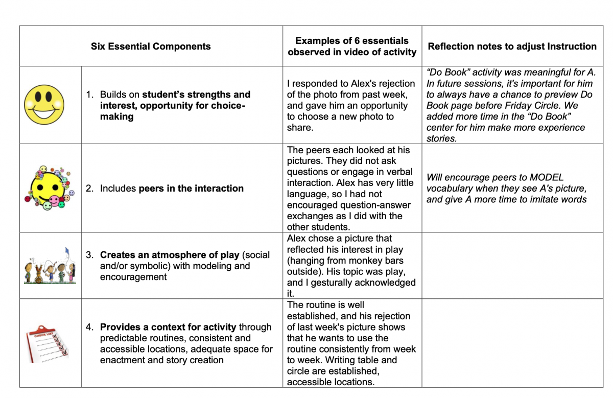 The activity in the video is from our Friday Circle Time. On “Do Book Fridays” the students each brought a page from an Experience Journal (we called it the “Do Book’) which they had created during center time on Thursday, using photos of activities they had participated in during the week. They shared the “story” with their peers, one at a time, and each peer had a question card (Who, When, Where, What do, etc) that they used to prompt questions about the activity. On this Friday, Alex had missed school the previous day, so did not have a current page to share with the group. I thought he could use a picture he had shared in the past, and was surprised when he said the picture I used was “finished” and gestured to the table where he usually created his Do Book page. I sent him to the table to create a page to share with the paraeducator, and he happily returned to show the group his updated journal entry. I wanted to share this video because it was an example of the importance of including peers in the sharing of the experience story.
