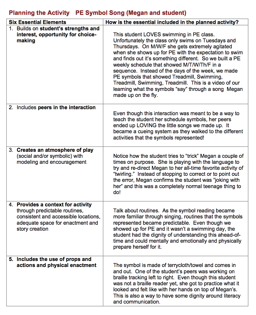 I never would have imagined during my training in Speech and Hearing Sciences that I would one day be improvising lyrics to “Grandma got Run Over by a Reindeer” when teaching emergent literacy. This student still had trouble accepting when she arrived at PE and there was no swimming, but the dysregulated internal state was shorter and shorter with the introduction of her days of the week schedule. I hope that practitioners will consider using “Communication Intervention Plans”, such as accessible calendar systems (and the teaching and modeling of their access and use), in place of “BIPS” or Behavior Intervention Plans. Investment in these kinds of tools and “playing” with them pay in dividends with regard to literacy instruction, social connection, and self-regulation.