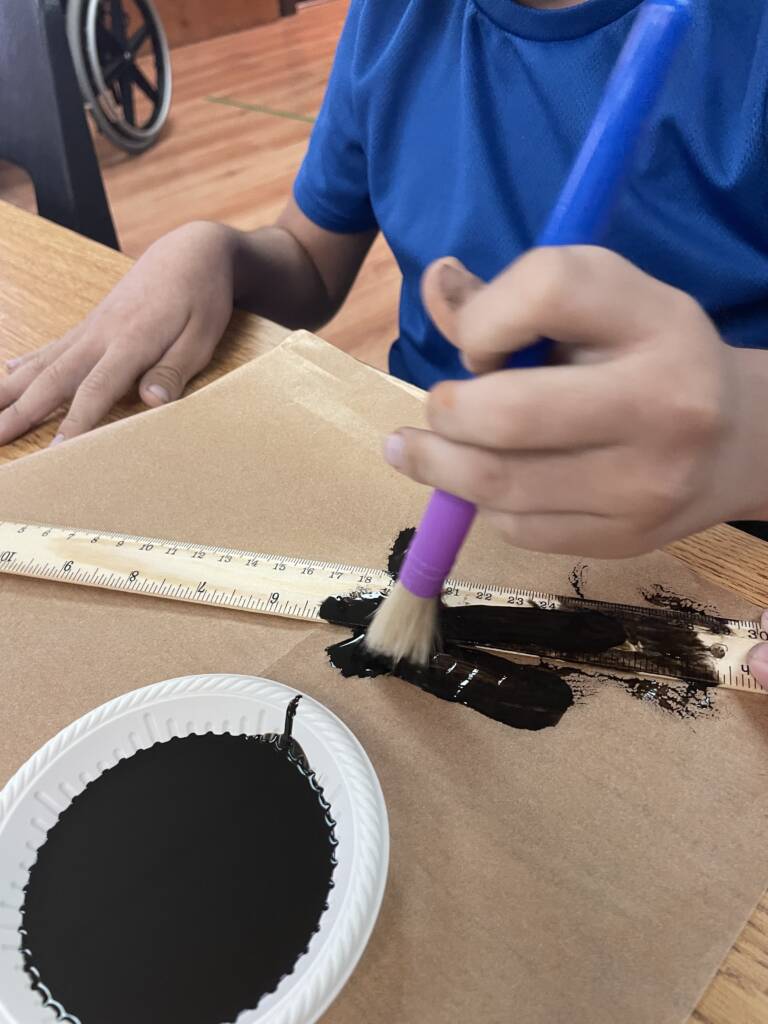 The first thing I have my students do is to either write their names or use their name stamp to mark the back of the ruler. Then students had to use the handheld sander to smooth the area around where I drilled the holes. I used a screwdriver to open the wood stain before using a scoop to gather some stain into a disposable bowl. A tack hammer was used to reclose the canister of stain. Several students wanted to try to close the stain. The tack hammer is light and my students enjoyed hammering the lid on. A disposable bowl was used to reduce the risk of spillage. While the stain is fairly easy to clean up, it can leave behind a long-lasting stain. Parchment paper was laid down to protect the table while staining the rulers. An added bonus was the parchment paper reduces sticking to the material under it. Disposable gloves were offered to protect the skin from staining. To allow for drying, the items were kept in a secure location within the classroom or I stored them in my car.