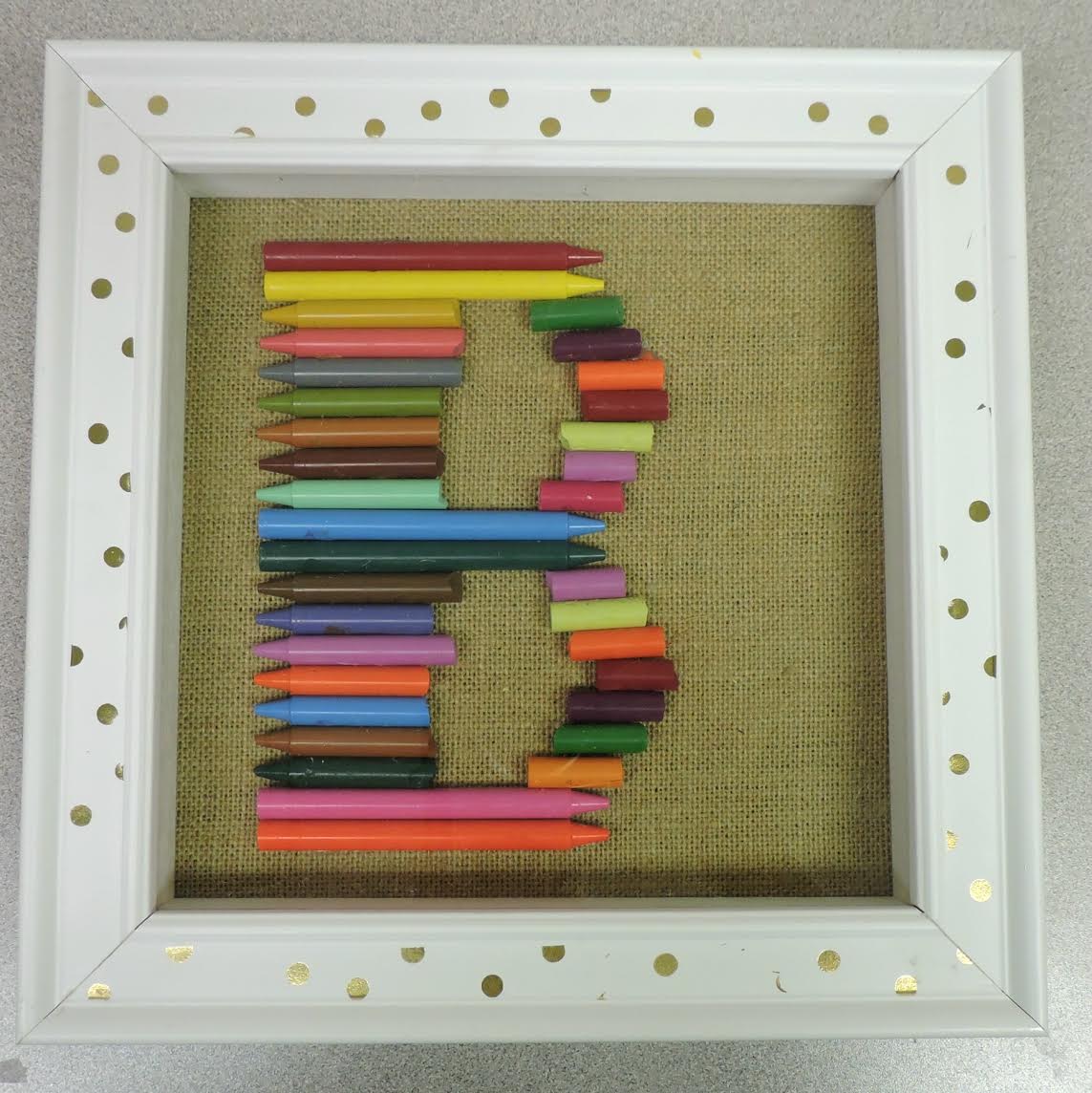 I looked at picture frames in Hobby Lobby and found these gems on clearance! I used Google Images to figure out how to make the letters “S” and “B”, but I recently noticed more ideas on Pinterest. After the students placed the crayons where they wanted them, I hot glued them in place.